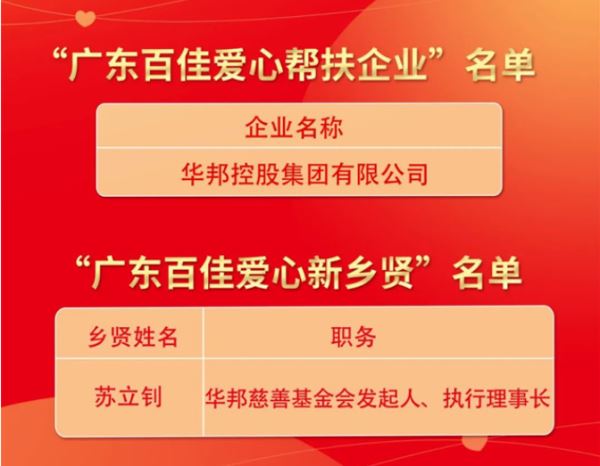 华邦荣获“广东百佳爱心帮扶企业”称号 苏立钊获评“广东百佳爱心新乡贤”