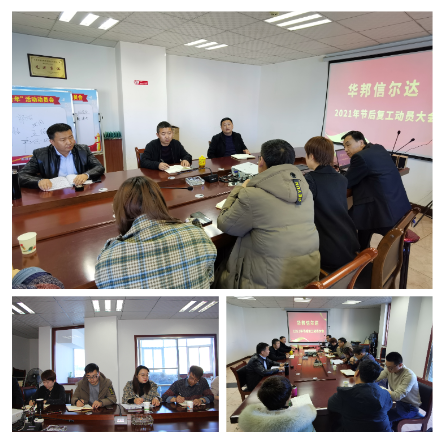 2021年2月19日下午,华邦信尔达组织召开了2021年节后复工动员大会。会议旨在贯彻落实集团公司复工复产工作精神,研究部署全公司生产经营工作,确保完成2021年各项生产经营任务。公司领导班子成员及各部门负责人参加会议。